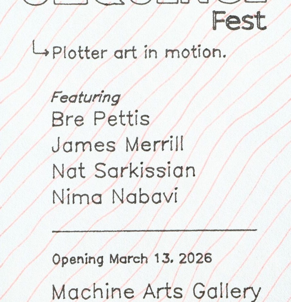 Sequencefest is an exhibition of animated works by James Merrill, Nat Sarkissian, Nima Nabavi, and Bre Pettis. The show brings together four distinct voices in generative and motion-based art, exploring plotted movement, digital animation, and screen-based storytelling within a physical gallery environment. Animations will be shown on screens throughout the...