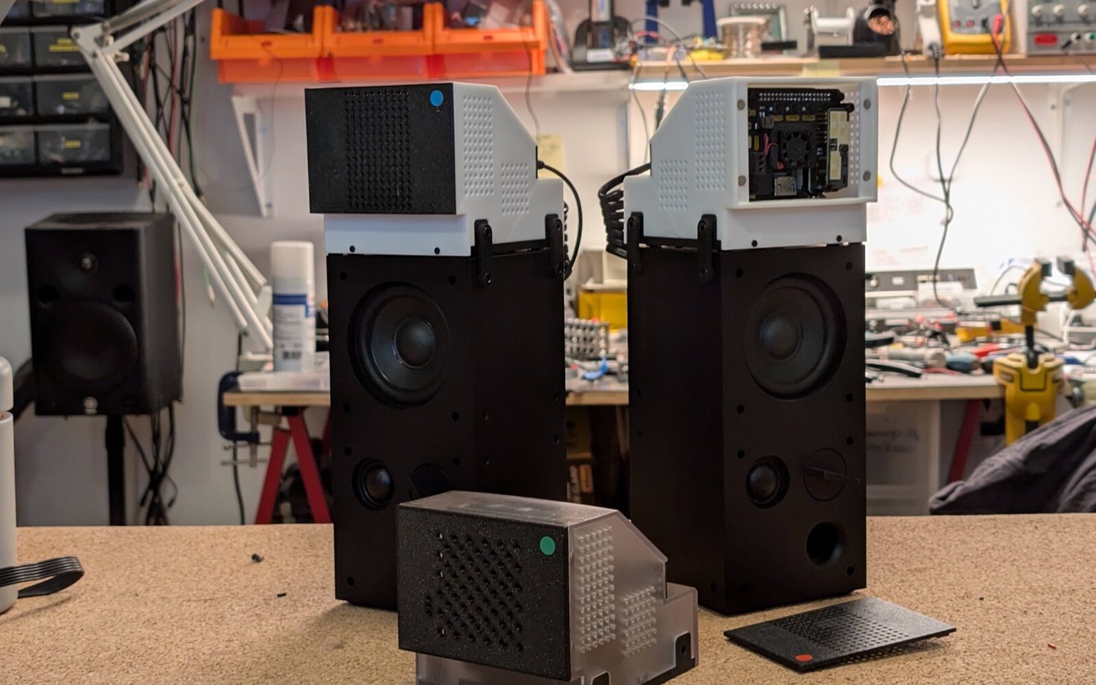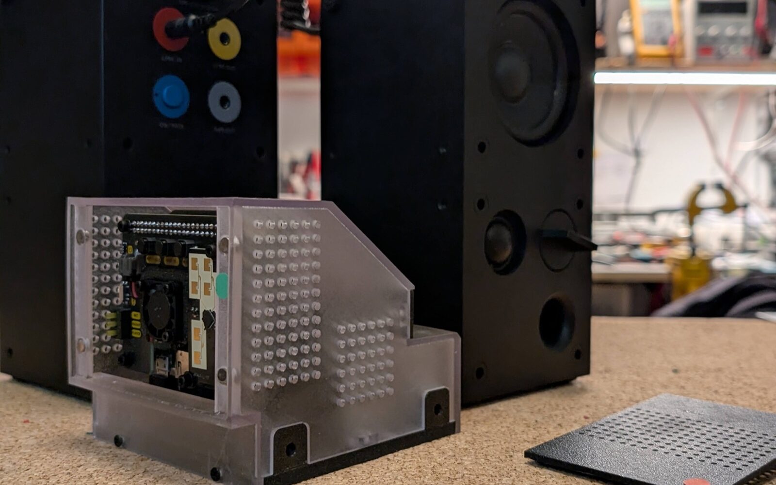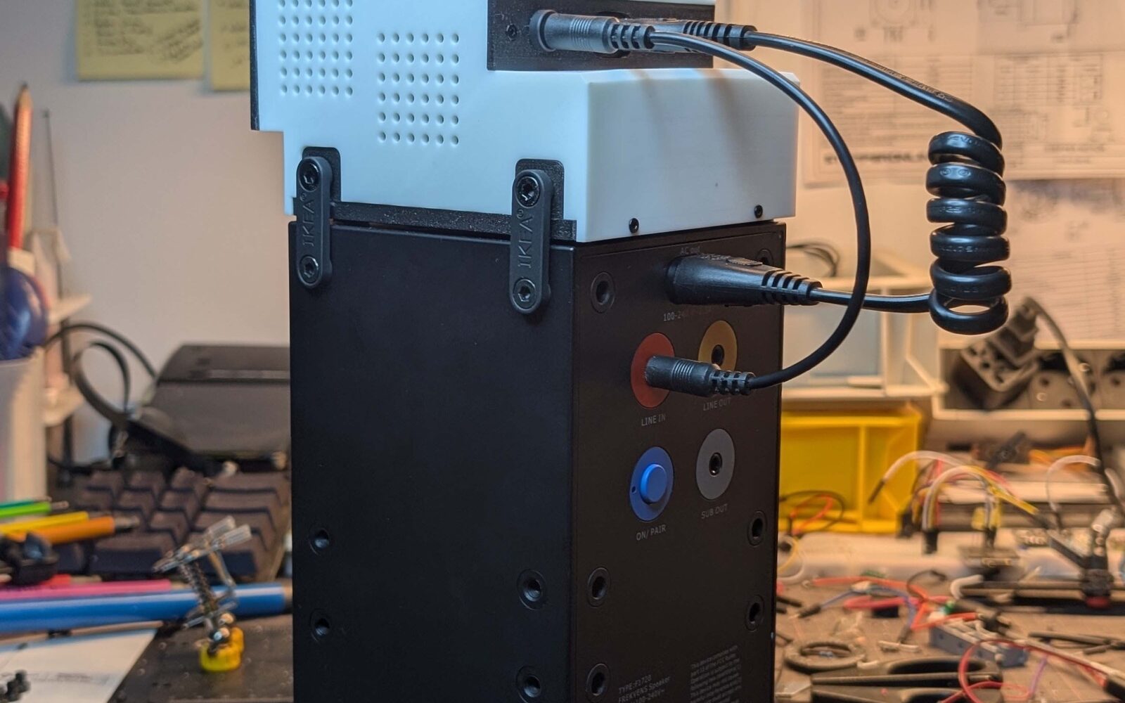 It can’t play audio on its own, so it requires an additional accessory (shown in the image: Ikea FREKVENS speakers designed in collaboration with Teenage Engineering). Following this theme, it’s designed to look like a real industrial product. The form—somewhat brutal—draws inspiration primarily from the speakers themselves. It includes product-like details: easy user-configurable WiFi and simple press-based power controls. These elements are designed with the same care you’d expect in a real IoT product’s software.