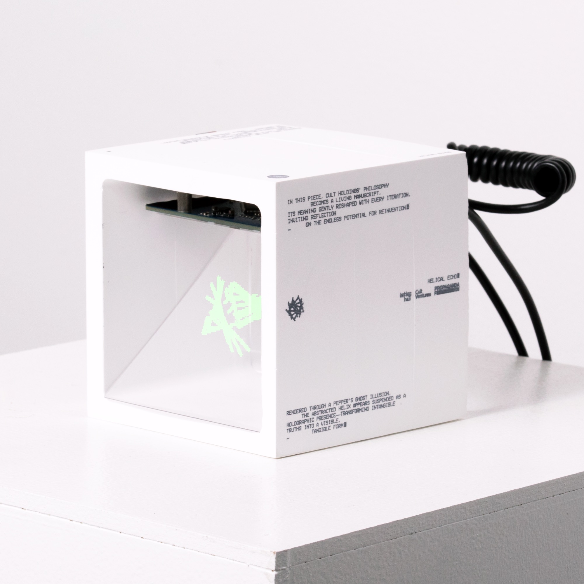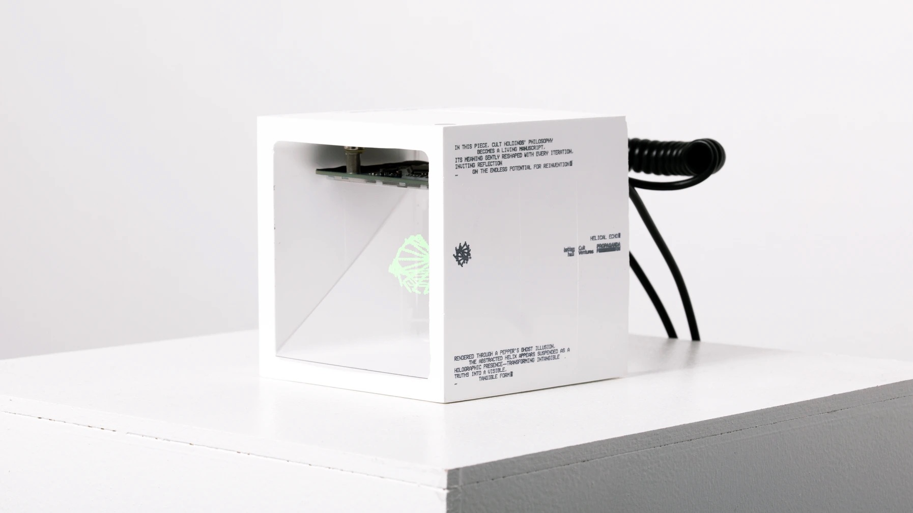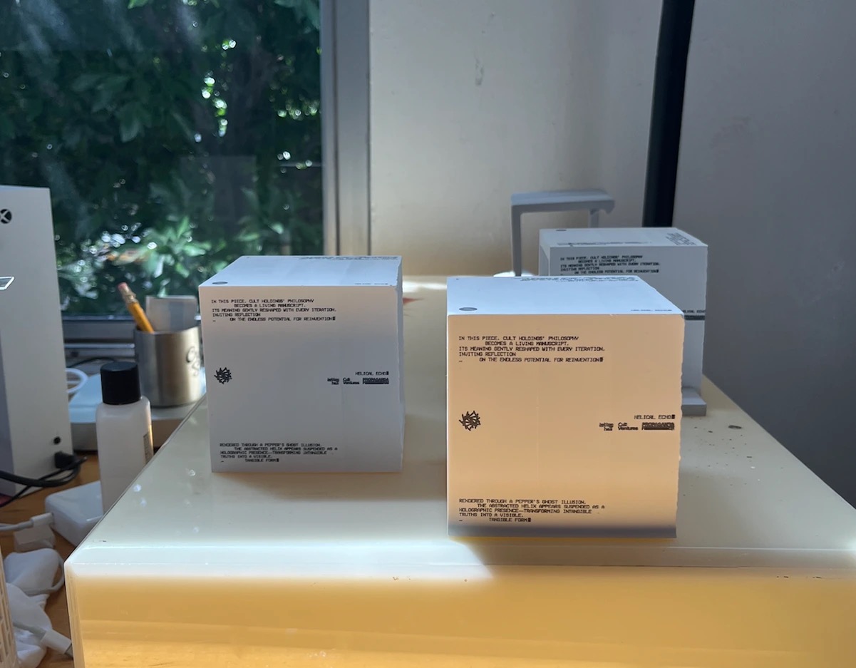 Looping sequence of abstract forms, inspired by the structure of DNA. Segments shift and rearrange over time, echoing the foundational seed of Cult Holdings and the idea of doctrine as fluid, open to flexibility, belief, and change. In this piece, Cult Holdings’ philosophy becomes a living manuscript, its meaning gently reshaped with every iteration, inviting reflection on the endless potential for reinvention. Rendered through a Pepper’s Ghost illusion, the abstracted helix appears suspended as a holographic presence, transforming intangible truths into a visible, tangible form.
