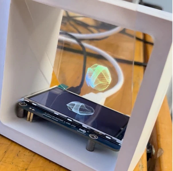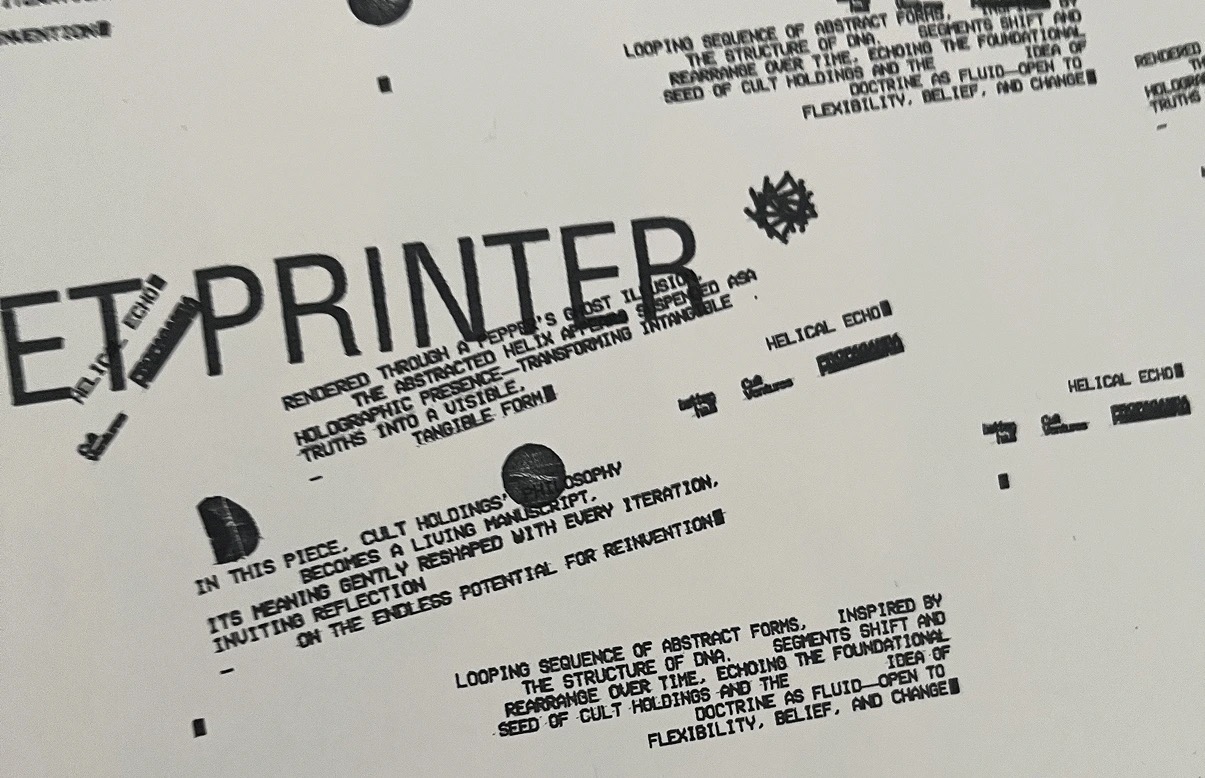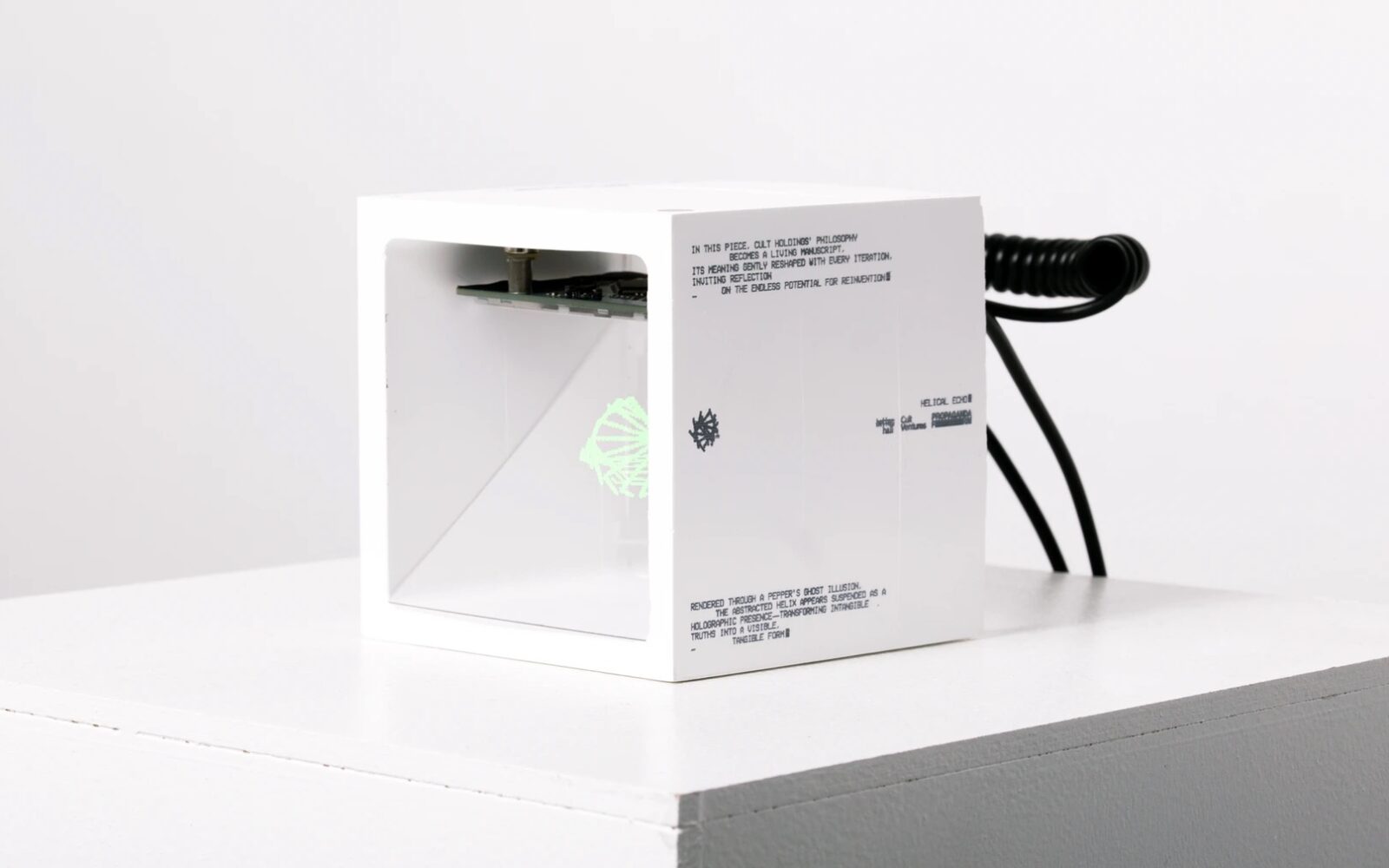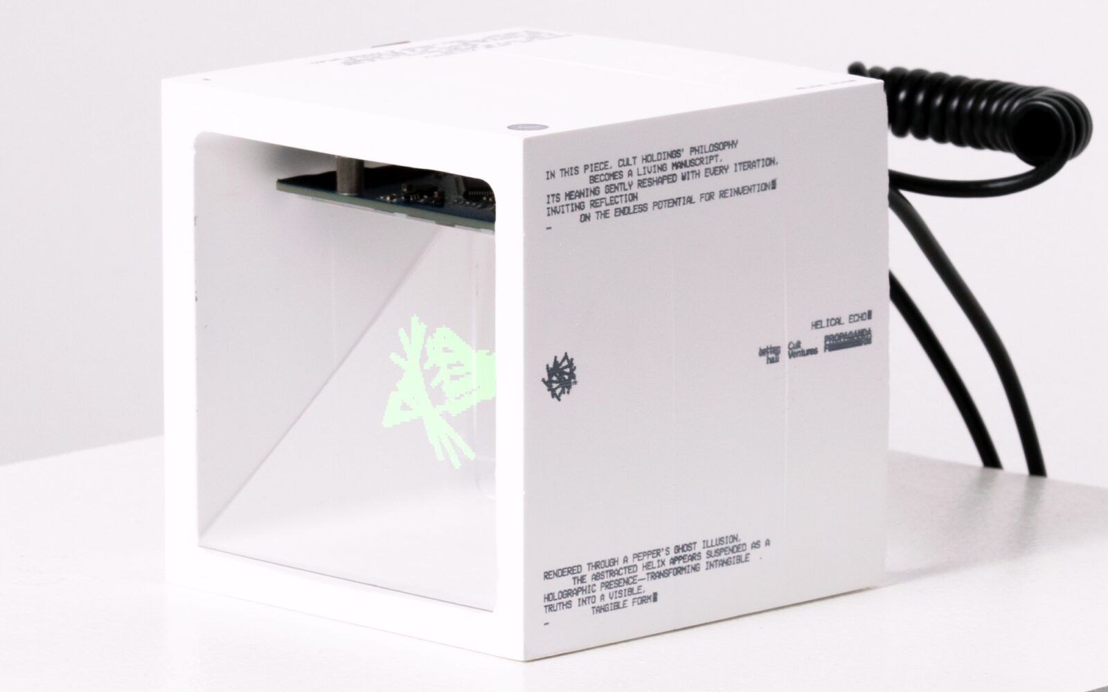 Looping sequence of abstract forms, inspired by the structure of DNA. Segments shift and rearrange over time, echoing the foundational seed of Cult Holdings and the idea of doctrine as fluid, open to flexibility, belief, and change. In this piece, Cult Holdings’ philosophy becomes a living manuscript, its meaning gently reshaped with every iteration, inviting reflection on the endless potential for reinvention. Rendered through a Pepper’s Ghost illusion, the abstracted helix appears suspended as a holographic presence, transforming intangible truths into a visible, tangible form.