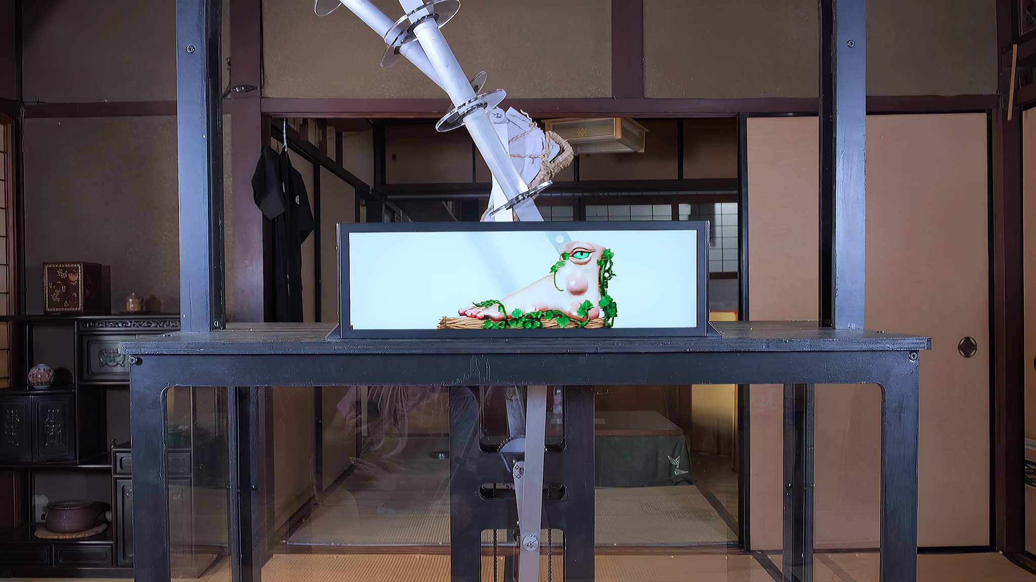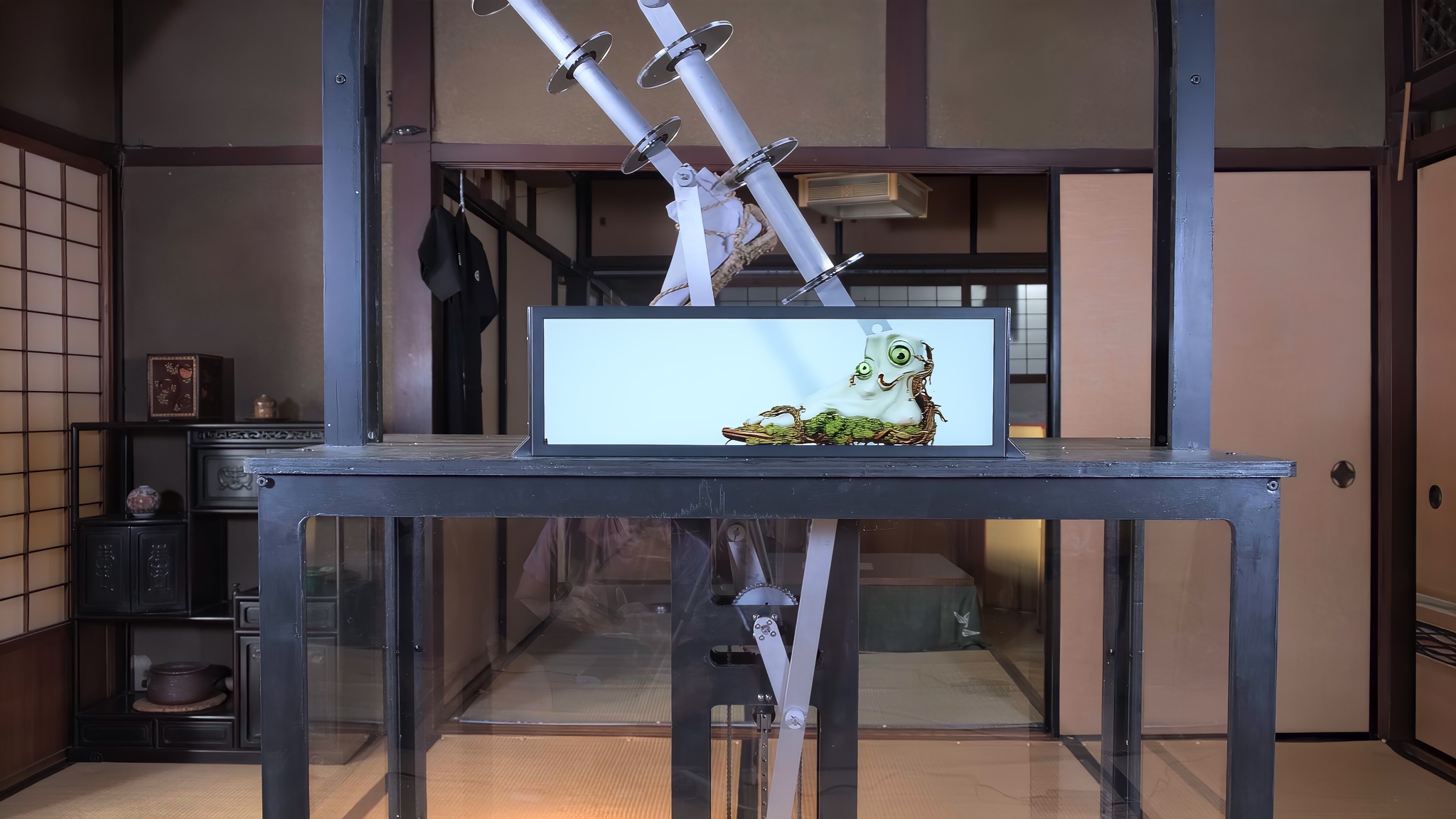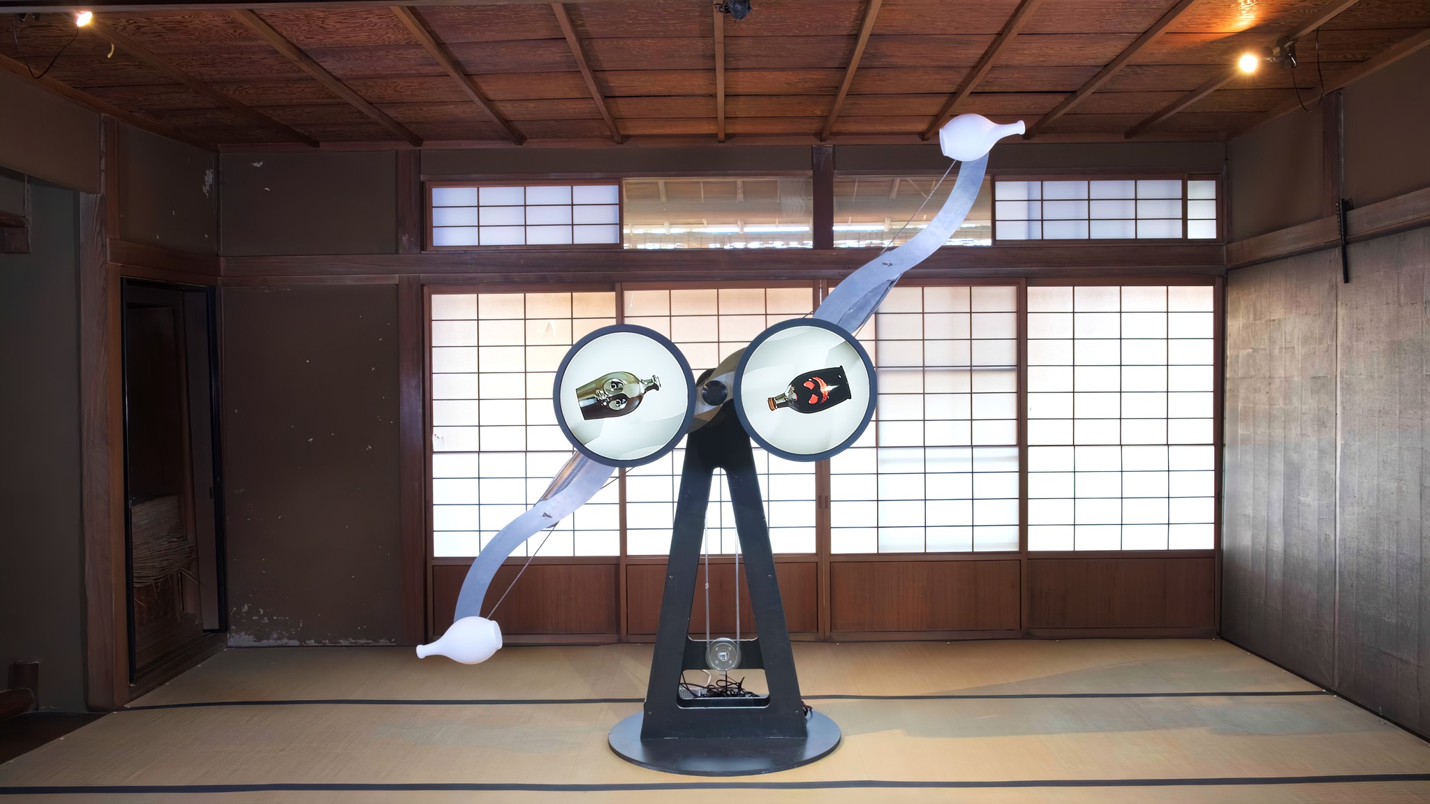 One sculpture features a sake bottle, the other a straw sandal. Both are inhabited by their respective tsukumogami spirits, Kameosa and Bakezōri, famously depicted in medieval illustrations. The physical objects glide past the displays in a mechanical choreography, while generative AI conjures the yokai inhabiting them. Each pass unveils a unique iteration of the spirit, ensuring a constantly evolving presence.