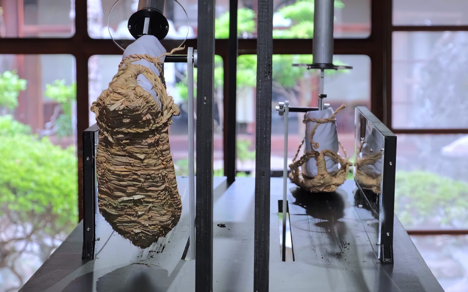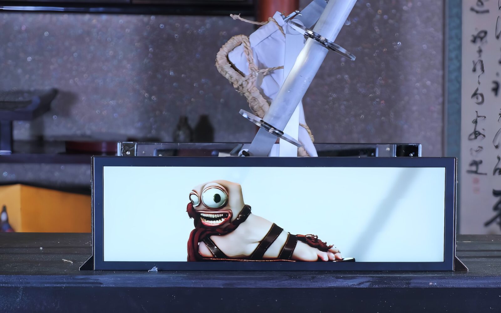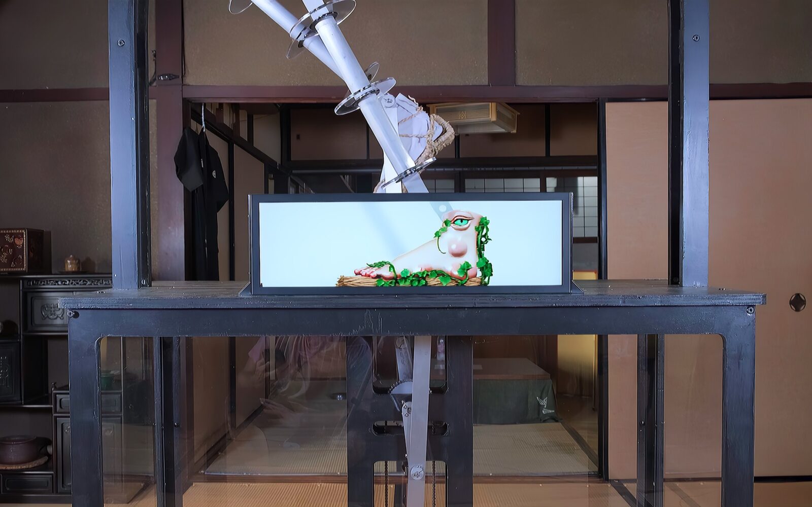 One sculpture features a sake bottle, the other a straw sandal. Both are inhabited by their respective tsukumogami spirits, Kameosa and Bakezōri, famously depicted in medieval illustrations. The physical objects glide past the displays in a mechanical choreography, while generative AI conjures the yokai inhabiting them. Each pass unveils a unique iteration of the spirit, ensuring a constantly evolving presence.