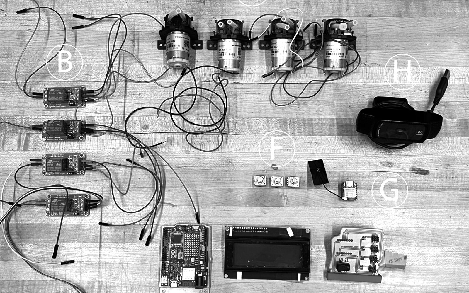 The device itself is vertically structured around this metaphor; a memory entering at the top and a scent emerging below. Internal subsystems (logic, relays, reservoirs, pumps) are physically separated to minimise interference. Structural elements blend CNC-milled PCBs, 3D-printed joints, and laser-cut acrylic for a layered, translucent aesthetic that echoes the machine’s conceptual focus on memory, transformation, and atmosphere.