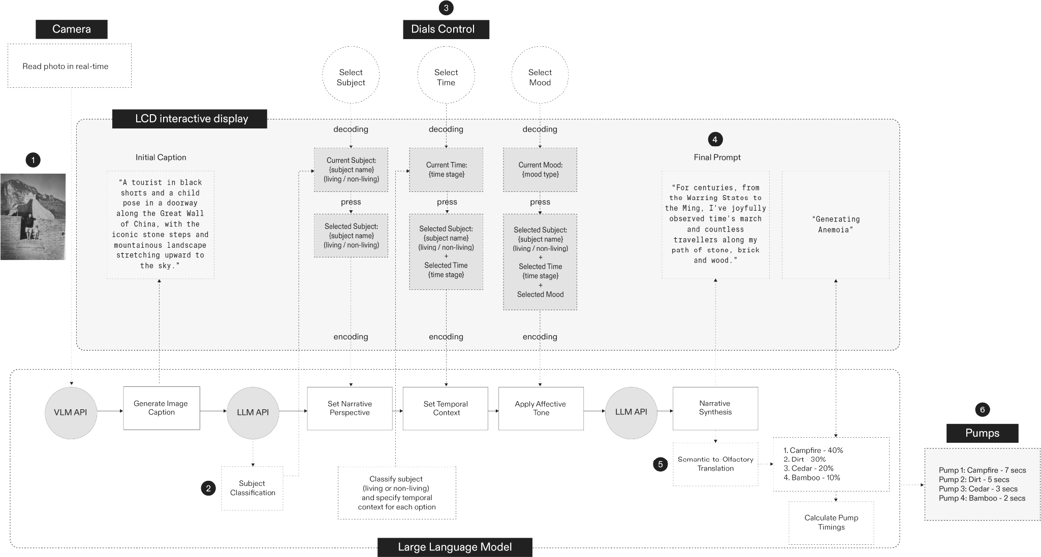 | 1. VLM-based image captioning / segmentation 2. LLM subject classification 3. Dial-based parameter selection (Subject / Time / Mood) 4. Prompt creation via LLM 5. Semantic-to-olfactory mapping using few-shot in-context learning 6. Scent rendering through olfactory display | XIAO ESP32S3 microcontroller Custom CNC-milled PCB 12V DC peristaltic pumps Modular aluminium frame with laser-cut frosted acrylic 3D-printed internal mounts (PLA) Silicone tubing and glass reservoirs | Multi-modal image analysis for semantic extraction LLM pipeline for narrative generation and cross-modal translation Orchestration layer: coordinating vision, language, and olfactory subsystems Embedded control firmware for real-time actuation and pump timing |