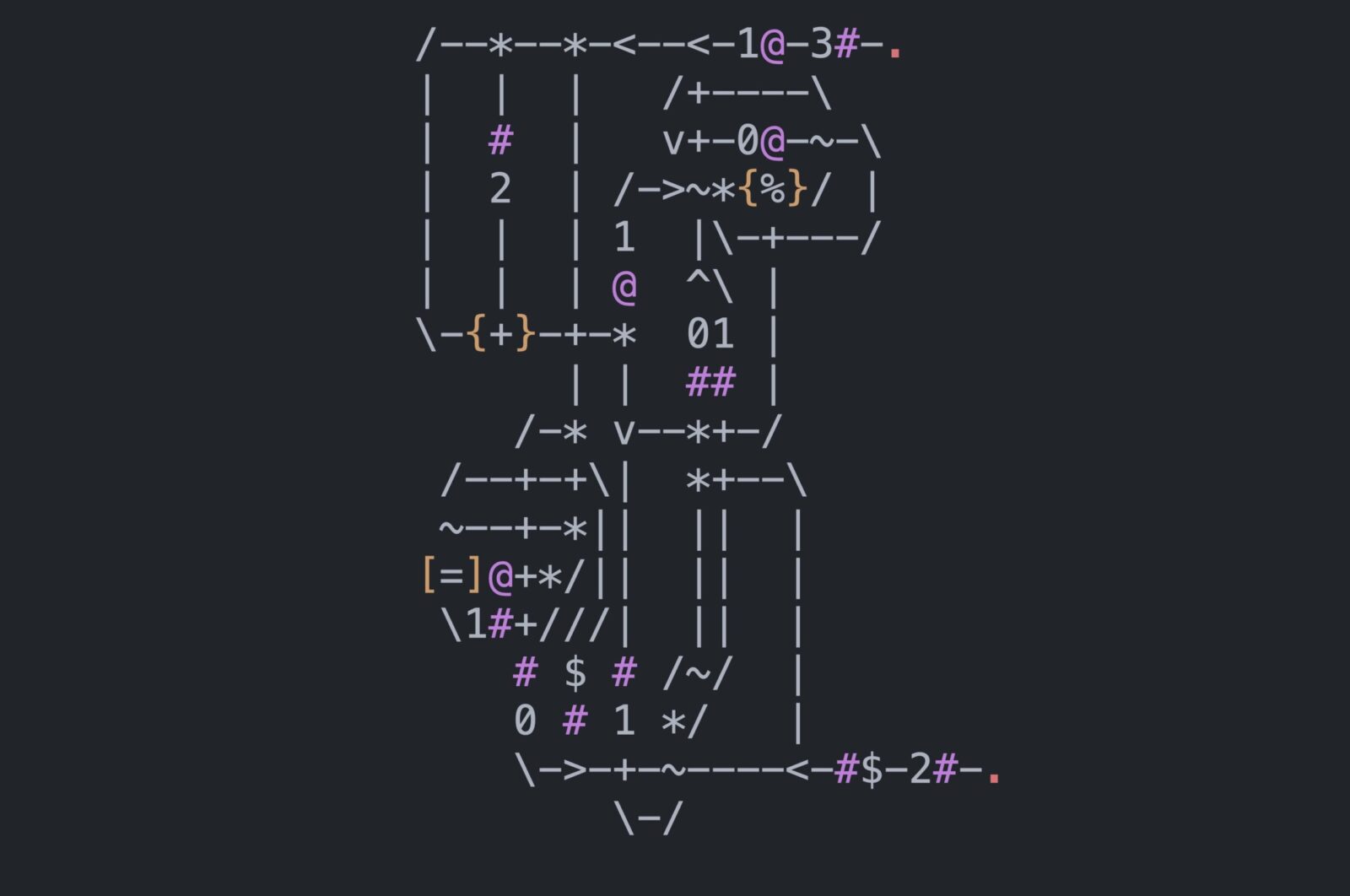 Created by Aaron Janse, AsciiDots is an esoteric programming language based on ascii art. In this language, dots, represented by periods (.), travel down ascii art paths and undergo operations.