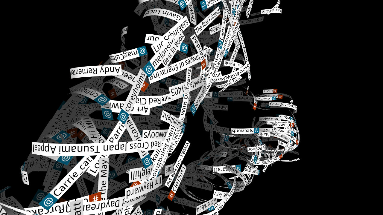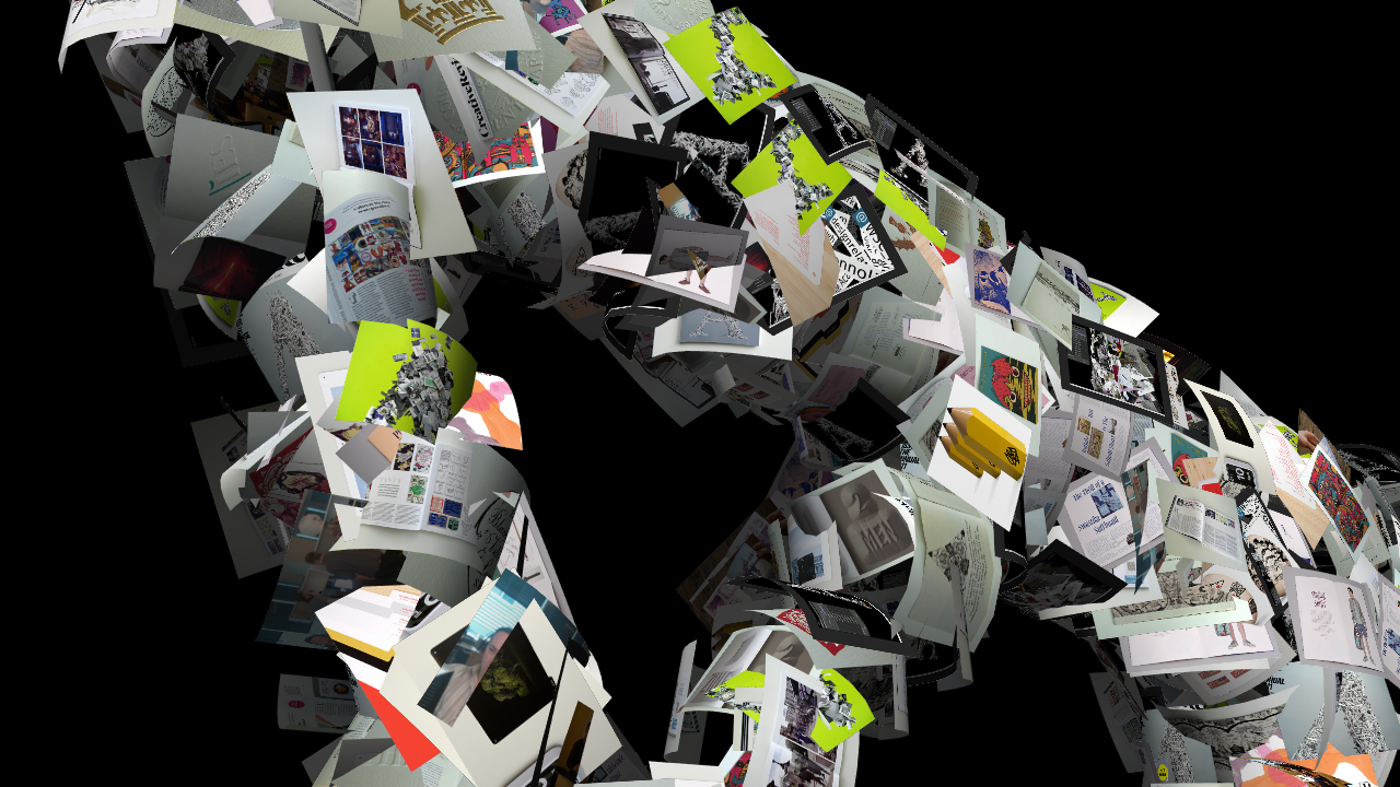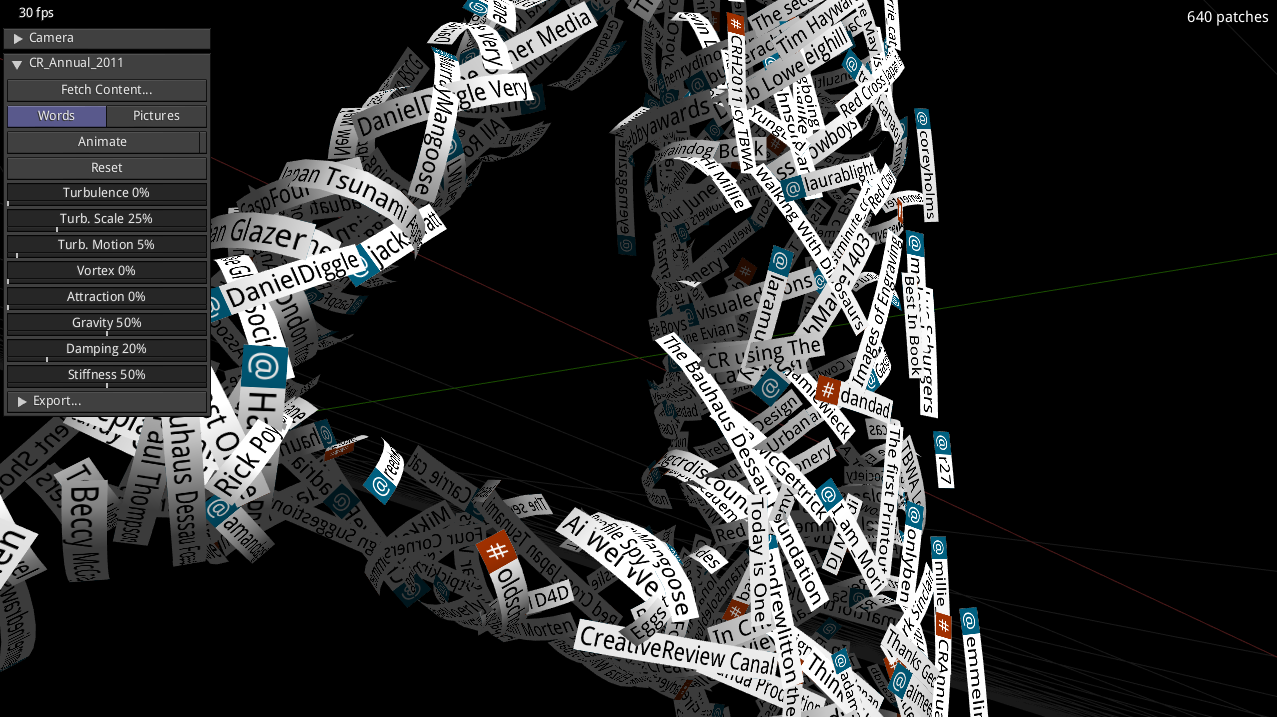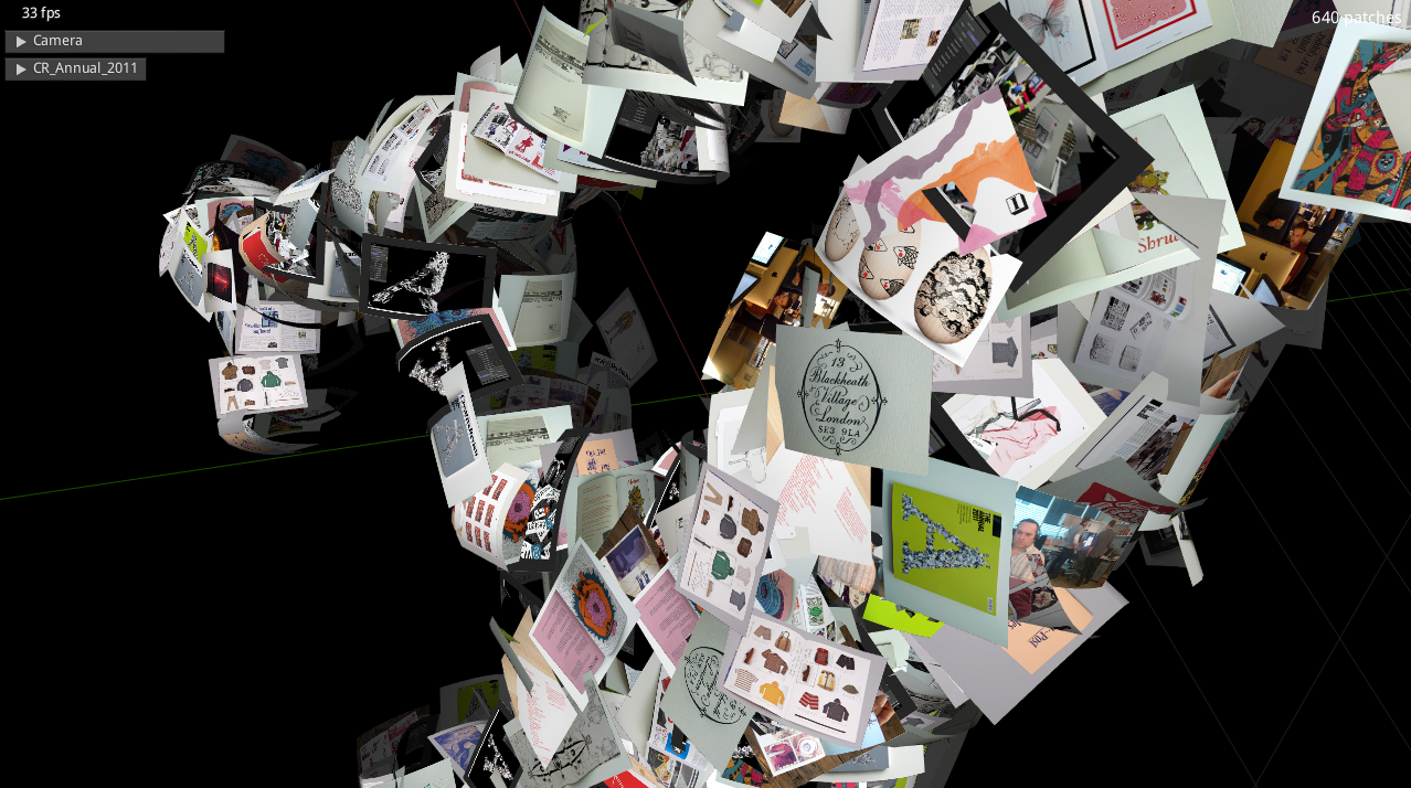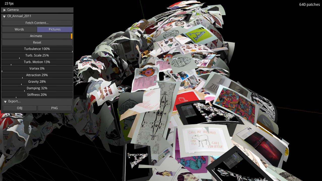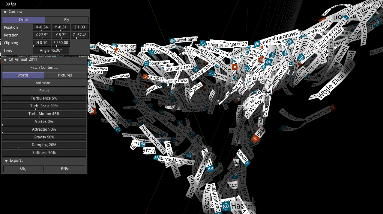 We decided to make an “A” from CR’s prolific online output. We felt that its form should be implied, discernable by its physical influence on elements from CR’s blog and twitter content. Some of our early efforts were a little abstract, but we settled for wrapping thousands of strips of tape in the loose shape of the “A”. The strips would contain words and pictures from the blog. Using recent blog activity doesn’t cut it for an annual, so with “a little wget magic”, we slurped every article and image from the last year. We got 10,000 unique proper names and places, hashtags and usernames, and about another 5,000 pictures. That’s a lot, even for six images, so the number of comments on a blog post became a metric for how “big” a story and its content ended up in the final image (like a “tag cloud”). To add some dynamics, we ran the scene as a cloth simulation to blow our strips around a bit. Exploding the letter is fun, though in the end the shapes looked a bit messy so we toned that down a bit. Final snapshots of strips in motion were exported for a high-quality render.