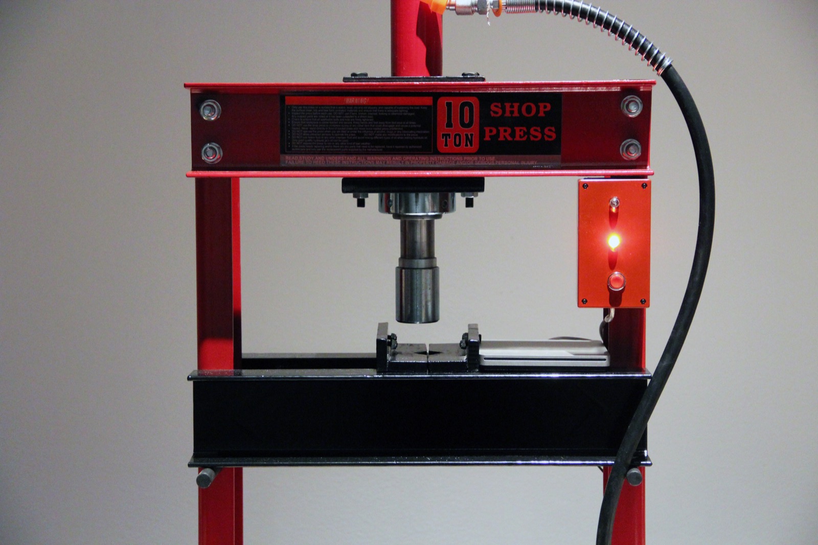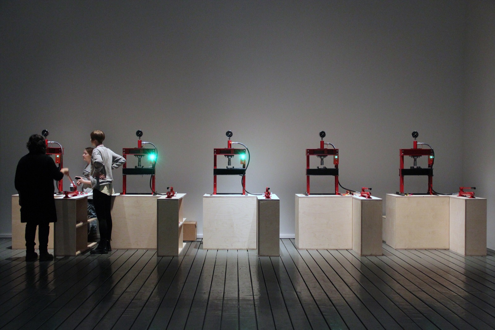Per 10 ton hydraulic press, the hardware includes an Arduino Uno, a microphone, preamp and a MacMini + Apple CD Drive. The software was made using Pure Data, Max/MSP and AppleScript.