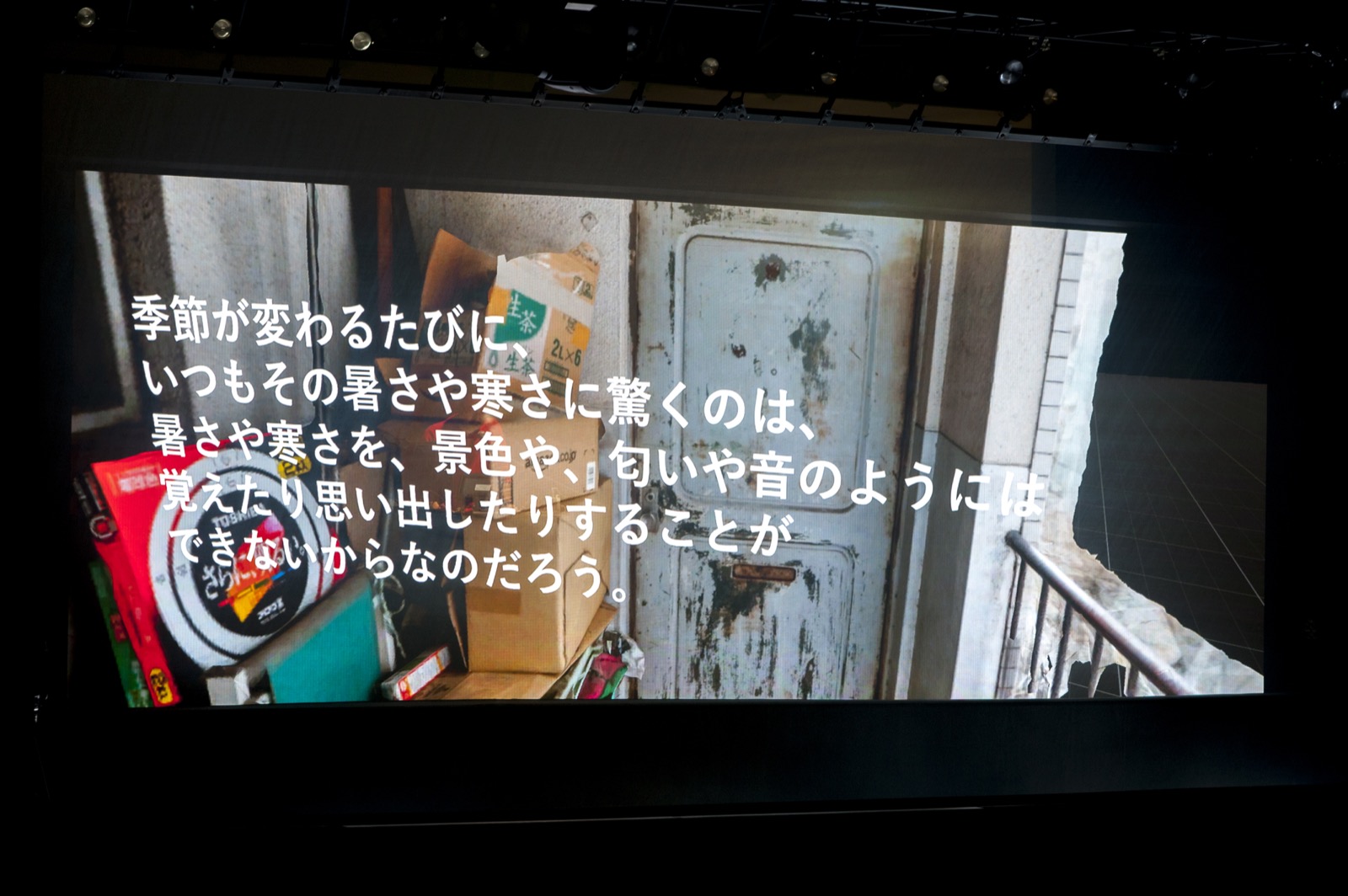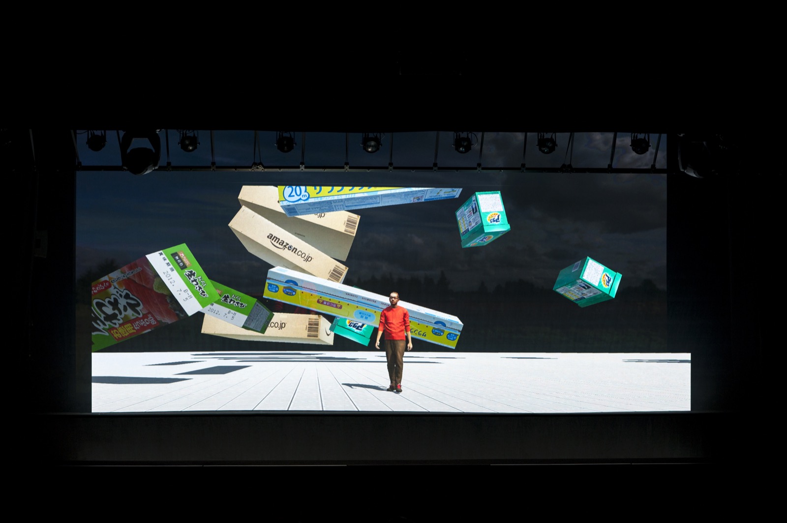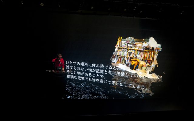 The projection combines rendered elements as well as scans of Akihiko’s familiar physical environment, including workspace, neighbourhood’s alleyway, his computer and food. It’s a capture of Akihiko’s physical world, experienced in a re-arrangement and presented to the audience in realtime using Pepper’s Ghost technique.