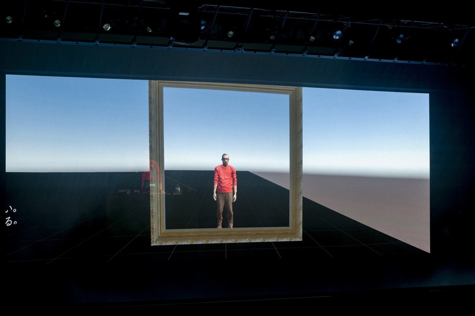 The project/projection is a 3D scanned Akihiko and its texture that covers the surface of his body scanned on the 10th of February 2016. Hence, Akihiko is presented as himself on 26th March 2016 controlling himself on the 10th February 2016. In addition, while exploring these contradictions of reflected+realtime image of oneself, Akihiko is also interested in how computer efficiency, in this case far clipping planes of 3d software and software deleting distance objects as well as their “backs” (backface culling), alters perception of oneself through reflection.