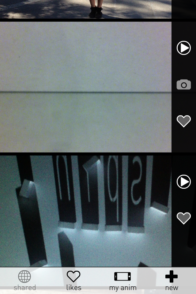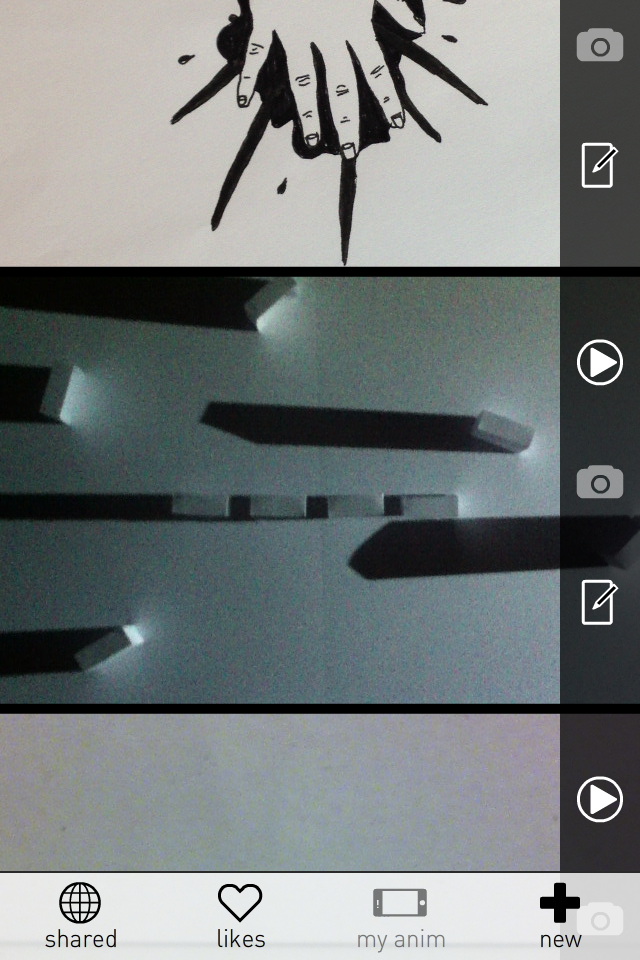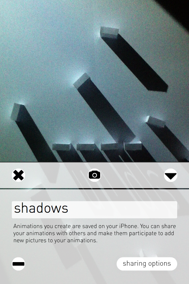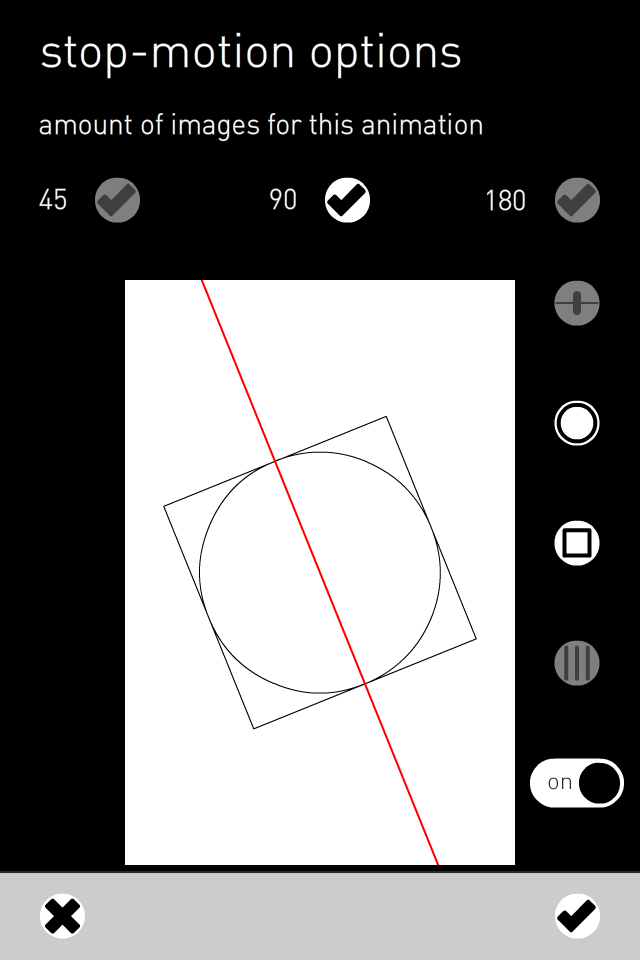 The creation is made frame by frame. For each picture taken, a main line that crosses the screen trough its middle is a guide to align something on it. This line turns a few degrees after each shot to make a complete revolution. The baseline is created by using the guide remains horizontal when the screen rotates. The app also allows you to modifying others’ stop-motions by reworking them and sharing them back with the community.