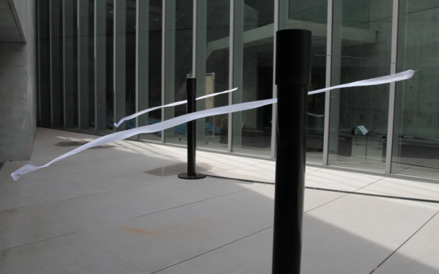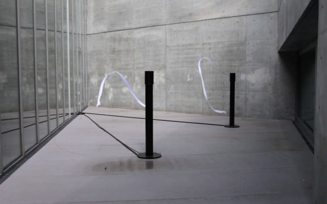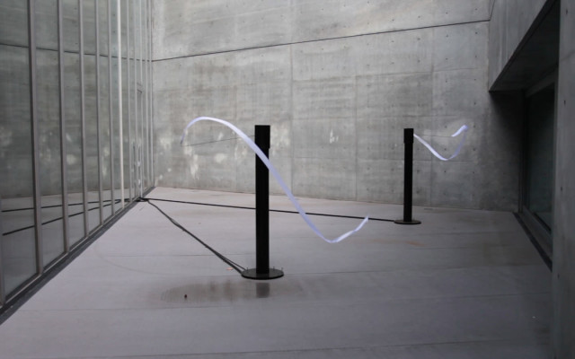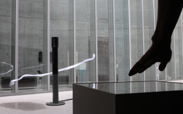 Set in the external space of the 21_21 exhibition ‘Motion Science’ in Tokyo until 27th September, the installation invites visitors to interact with Leap Motion device by manipulating the distance of hand to the device. In doing so, the angle of rotation arm alters, thus manipulating the radial movement of the ribbon attached to the arm. The project explores an emergence that occurs when connections is made through movement, from the user to object – in this case a ribbon.